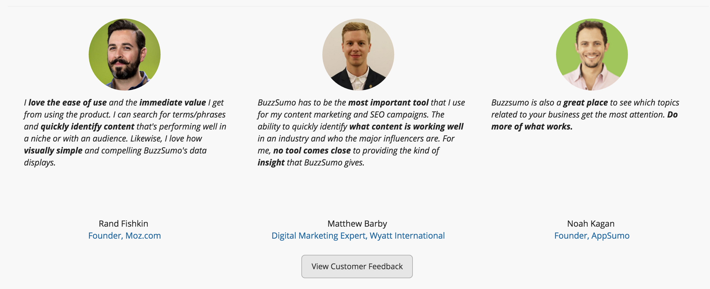 On BuzzSumo’s pricing page, the company adds a customer’s quote about their product along with a photo and title of the person. This tactic quickly validates their services.